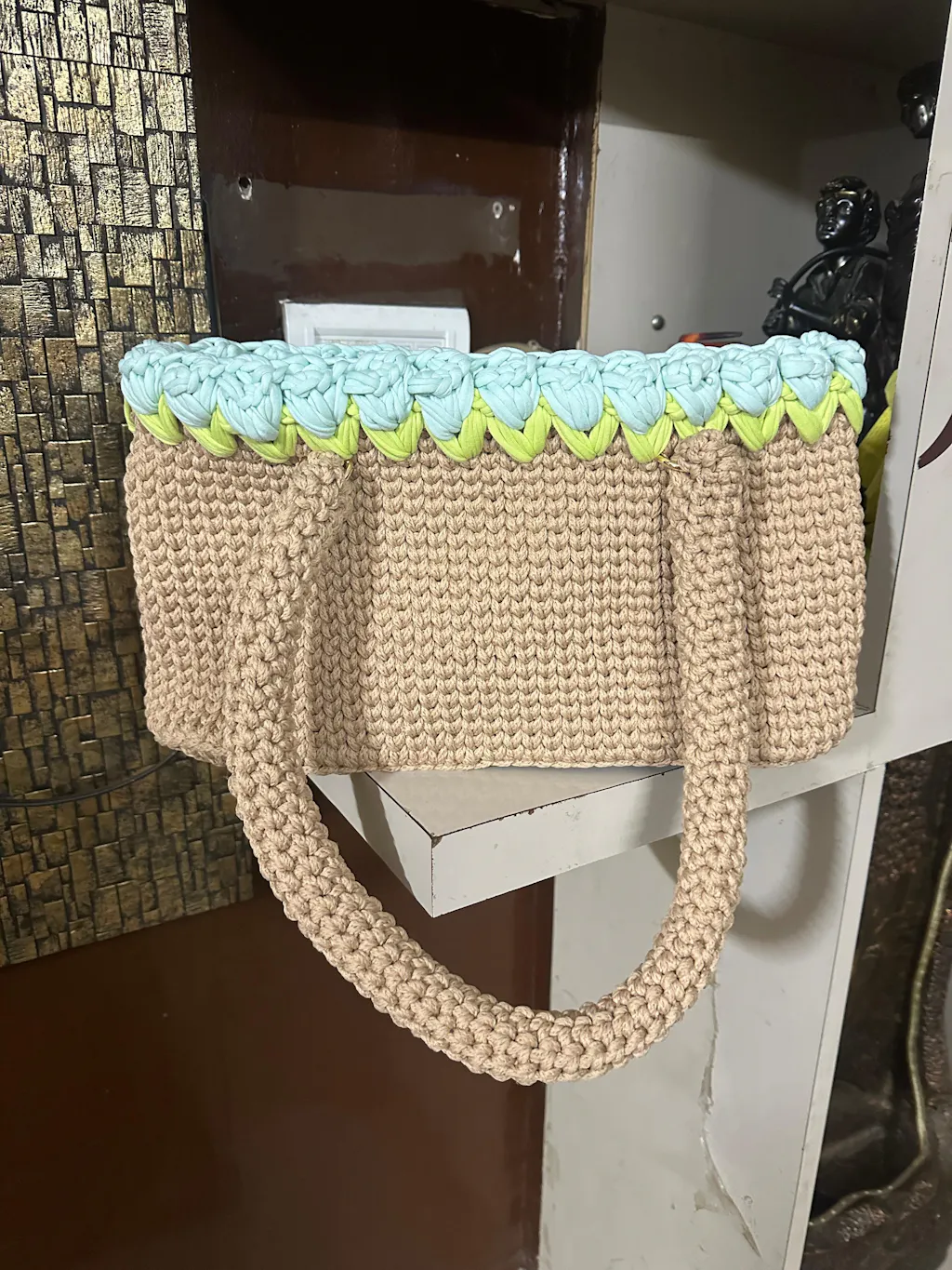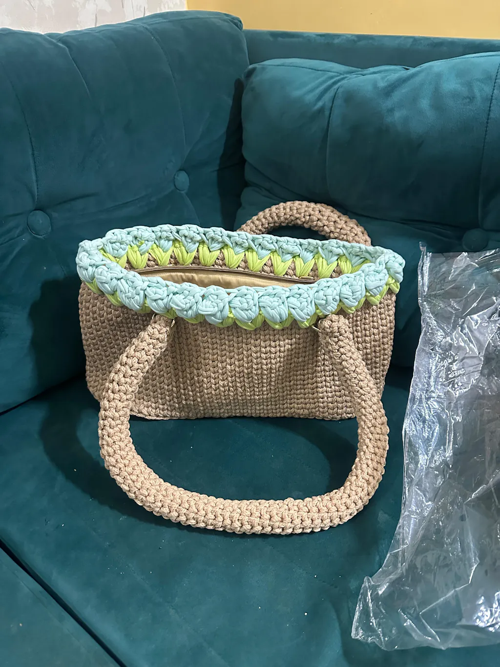 Beige Crochet Tote With Light Blue Tulips