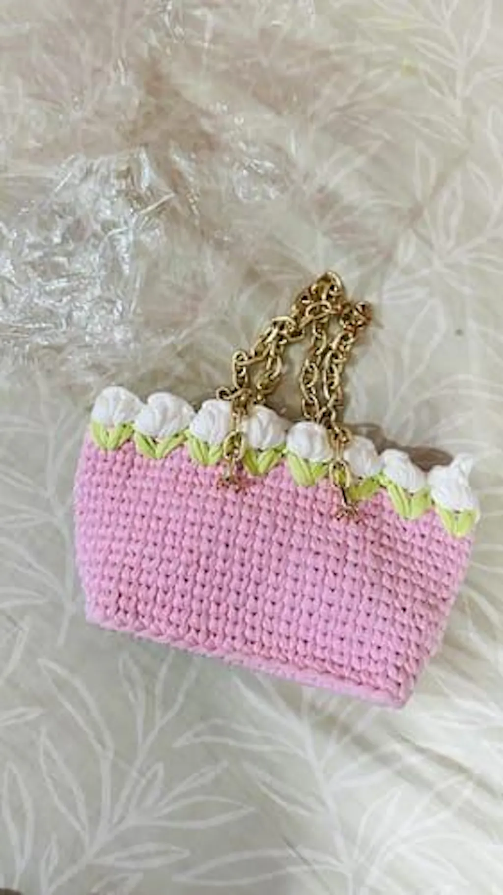 Ligh Pink Tulips on White Handmade Crochet Bag